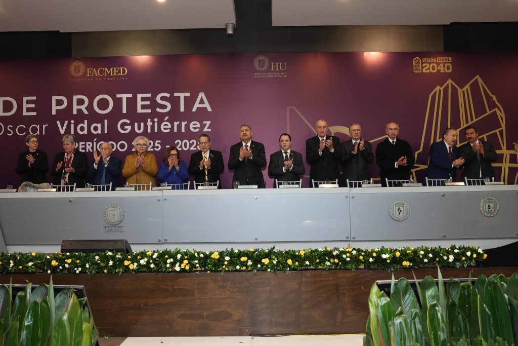 El Dr. med. Oscar Vidal Gutiérrez rindió Protesta para un segundo periodo como Director de la Facultad de Medicina y Hospital Universitario de la UANL, reafirmando su compromiso de continuar fortaleciendo a la institución en sus ámbitos académico, clínico, administrativo, de investigación, innovación e infraestructura, así como cultural, artística y deportiva.