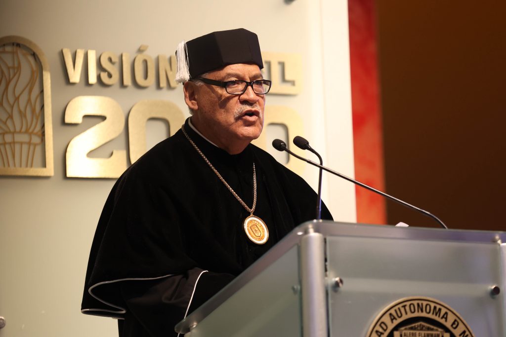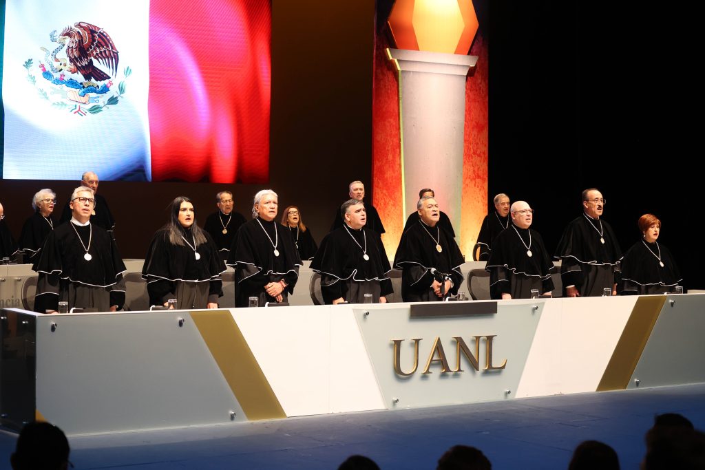 Serrano Sandoval, egresados de los programas de licenciatura como Médico Cirujano y Partero y Químico Clínico Biólogo, respectivamente, recibieron el Reconocimiento al Mérito Académico de la UANL, durante la Sesión Solemne del H. Consejo Universitario, presidida por el Rector, Dr. med. Santos Guzmán López, junto con los honorables integrantes del Consejo Universitario.